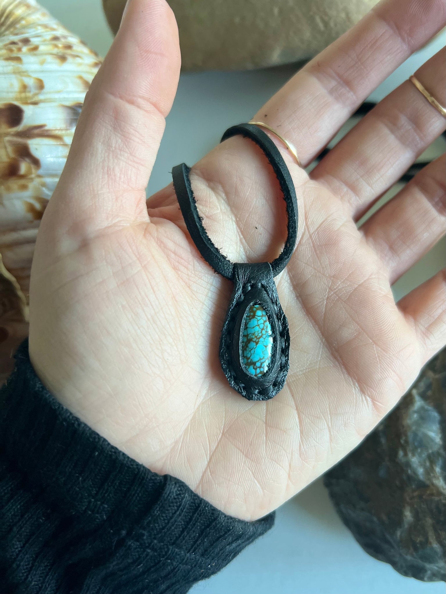 Beautiful Royston Turquoise cabachon hand set and stitched into recycled leather.
