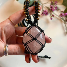 high quality rose quartz crystal hand wrapped in black leather cord, adorned with bronze beads.